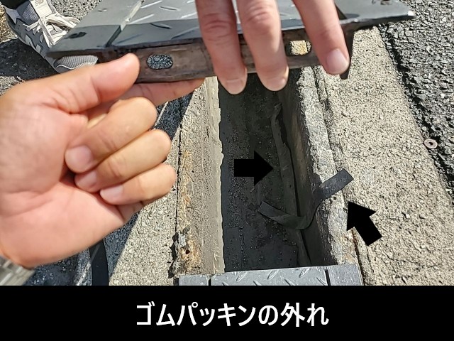 現地調査では、側溝の蓋・グレーチングに歪みや変形が見られ、さらに騒音防止用のゴムパッキンが外れている状態でした。また、過去に行われたボルト固定は内側1本のみで、車両の振動によってすぐに緩んでしまう原因となっていました。
